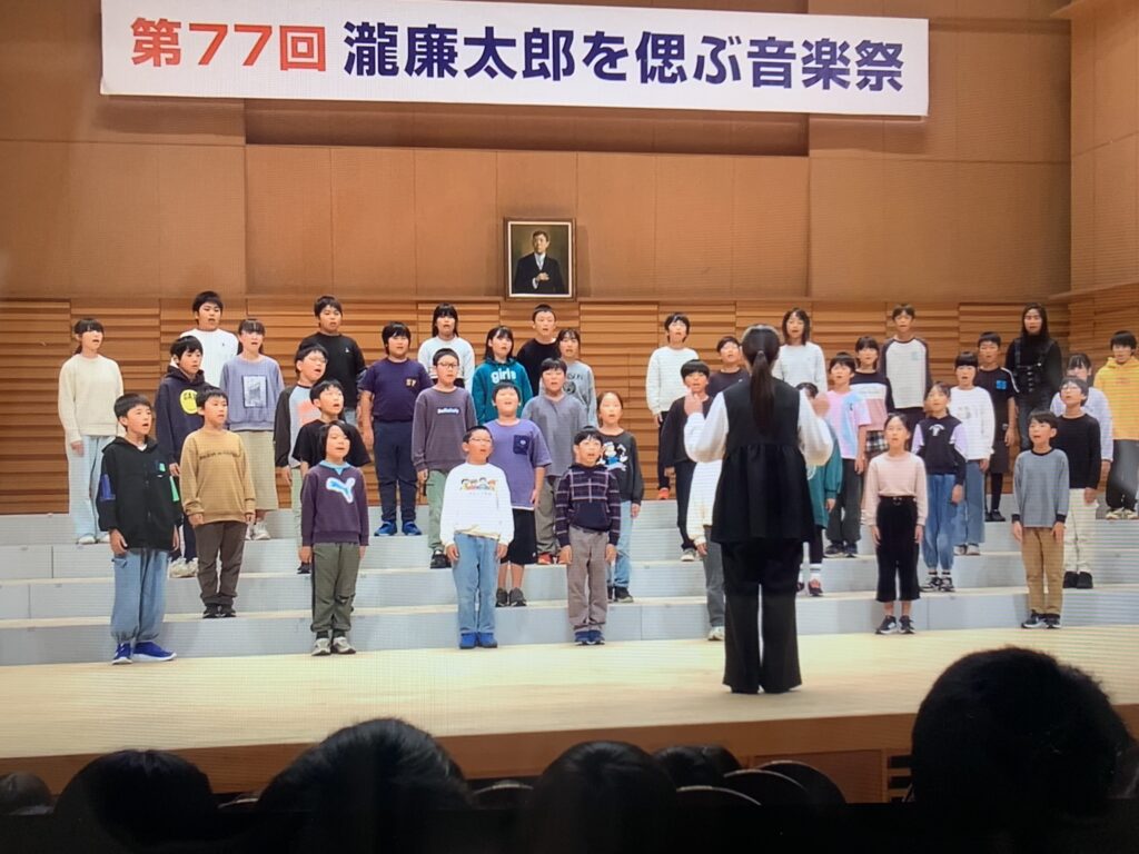 今年の音楽祭は、「地球星歌~笑顔のために~」の合唱に取り組んできました。参加した4~6年生は、この歌が大好きで、一人一人の目標を体育館の壁に掲示し、「自分の目標はどうだったかな。」と時折確認しながら練習しました。グランツたけたの素晴らしいホールで歌声を披露し、帰ってからはみんなで集まって振り返りの会を持ちました。録画した歌声をみんなでドキドキしながら鑑賞している子どもたちの表情がとても素敵でした。パートリーダーさんからの振り返りを聞いたり、振り返りカードに記入したりし、自分たちの頑張りや成長を実感することができました。