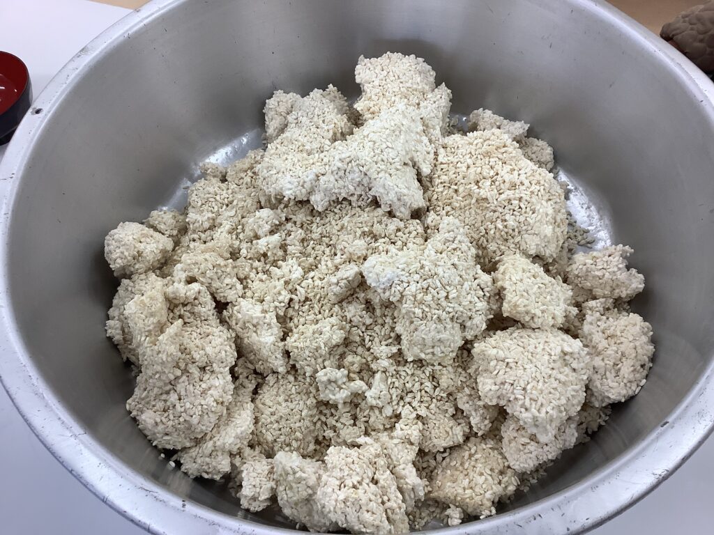 家庭科室には、大豆のにおいがいっぱいでした。懐かしい匂いです。 それから麹を丁寧に混ぜ込み、団子にして空気を抜きながら保存しました。