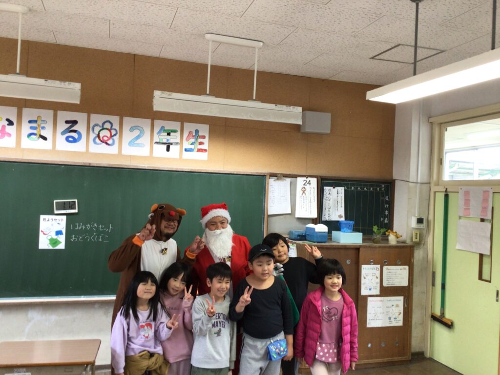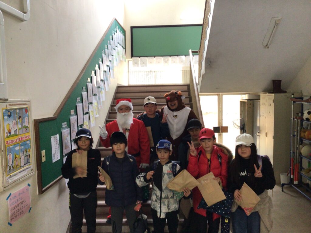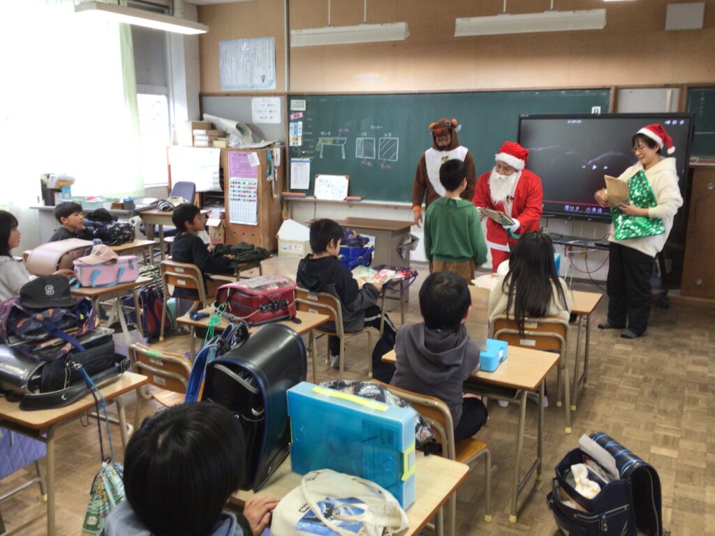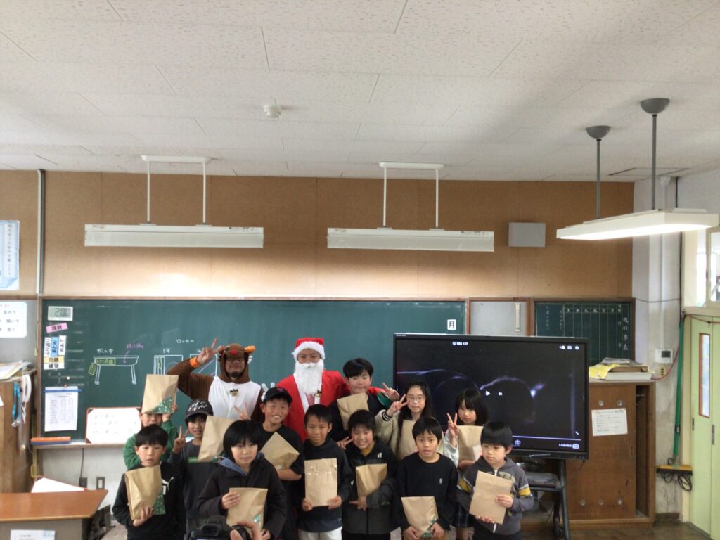 終業式の日、給食を食べそろそろ下校の時間!にサンタさんとトナカイさんと保護者の方々が、来校しました。子どもたちへ2学期がんばったごほうびです。突然の来訪に子どもたちはびっくり&にこにこ笑顔!日頃からも子どもたちに愛情をかけてくださっている保護者の皆様。ごほうびは「もの」で、ということだけではなく楽しませてくださるそのあたたかい気持ちが子どもたちの心に染みこんだと思います。サプライズありがとうございました。
