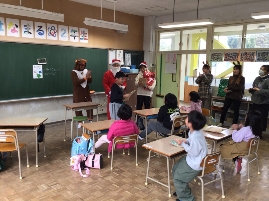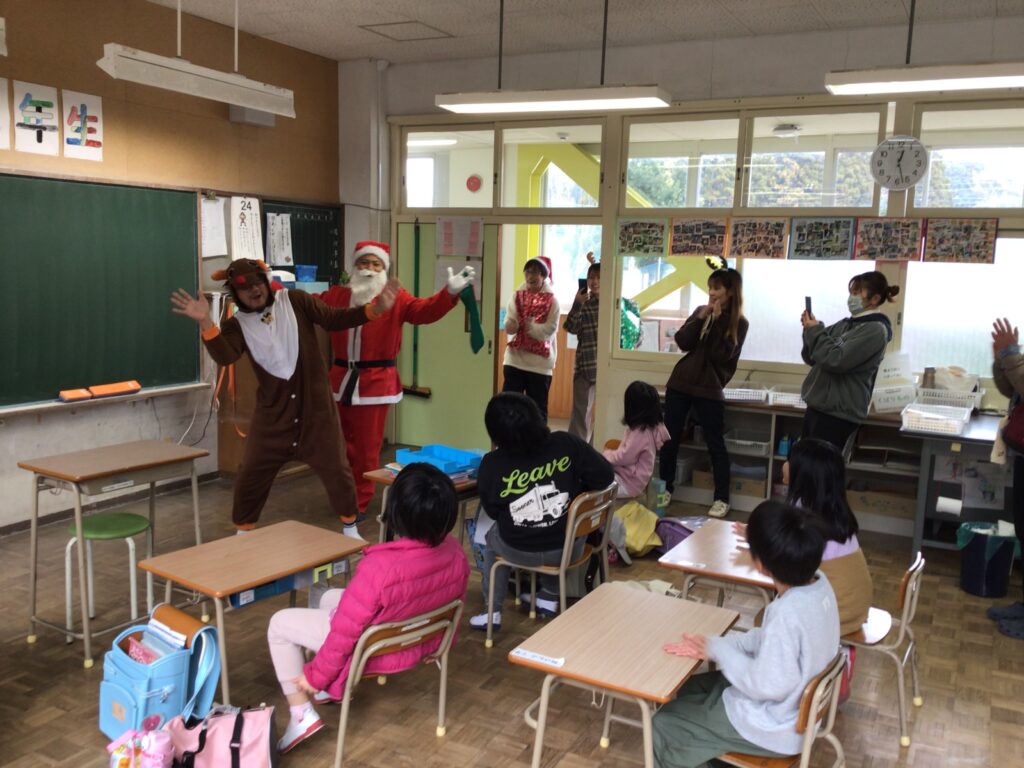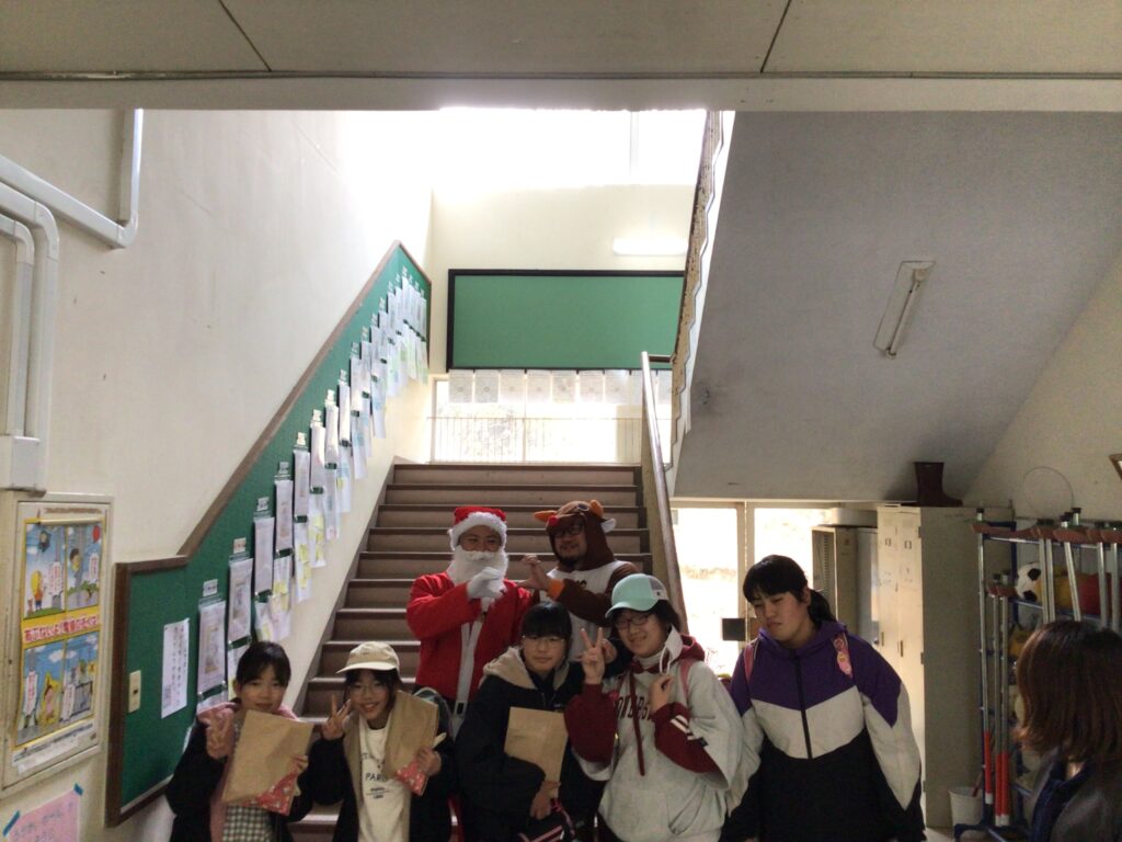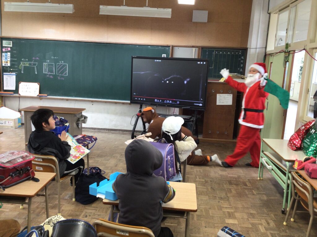 終業式の日、給食を食べそろそろ下校の時間!にサンタさんとトナカイさんと保護者の方々が、来校しました。子どもたちへ2学期がんばったごほうびです。突然の来訪に子どもたちはびっくり&にこにこ笑顔!日頃からも子どもたちに愛情をかけてくださっている保護者の皆様。ごほうびは「もの」で、ということだけではなく楽しませてくださるそのあたたかい気持ちが子どもたちの心に染みこんだと思います。サプライズありがとうございました。